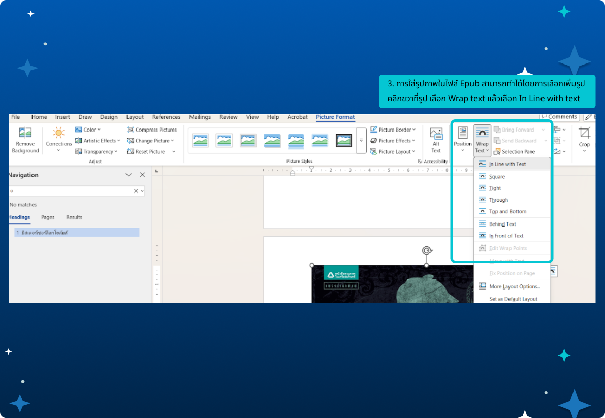 สามารถทำได้โดยการเลือกเพิ่มรูป คลิกขวาที่รูป เลือก Wrap text แล้วเลือก In Line with text