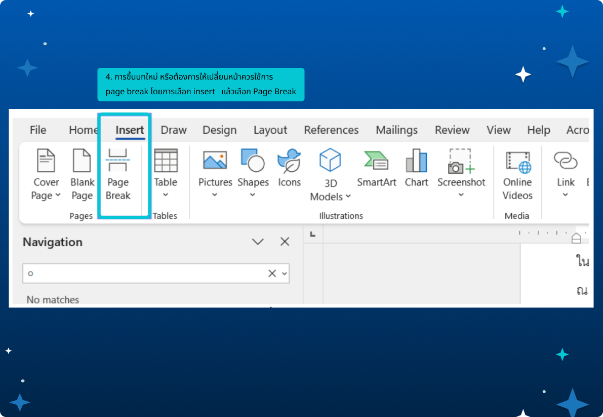 ควรใช้การ page break โดยการเลือก insert แล้วเลือก Page Break