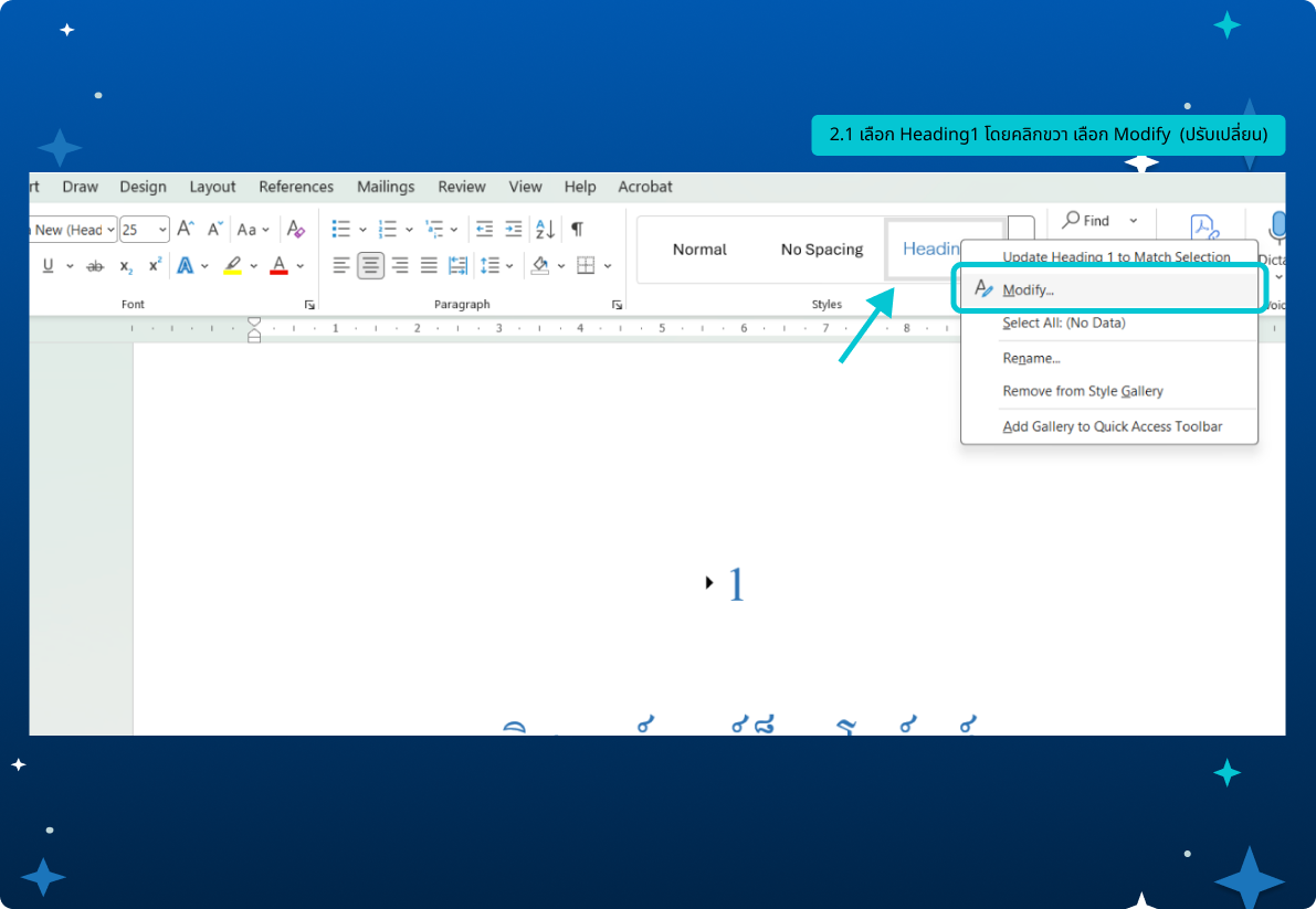 2.1 เลือก Heading1 โดยคลิกขวา เลือก Modify (ปรับเปลี่ยน)